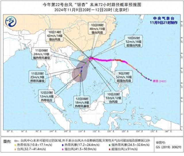 11月9日22时,台风“银杏”的中心位置在北纬19.1度、东经113.5度,具体位于海南省陵水黎族自治县偏东方向约370公里的海面上。台风中心附近的最大风力达到了16级,风速高达52米/秒。如此强劲的风力,将对所经过的地区造成严重破坏。台风的移动路径同样受到密切关注,预计其将以每小时约10公里的速度向偏西方向移动。预计在10日白天,台风将转向西南方向。最大的可能性是,在10日夜间,台风将从海南岛东南部近海经过,并逐渐减弱。