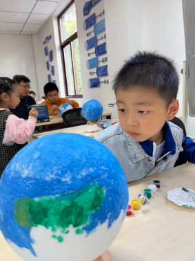 在备受期待的星球灯制作环节中,活动现场陈列着各式各样的空白地球仪模型。随着活动的进行,孩子们纷纷施展才华。他们运用丰富的想象力,手持水彩笔在地球仪上尽情创作。现场涌现出各式创意,如有的孩子描绘出心中那片深邃的蓝色海洋,其深邃的蓝色仿佛能引领观者进入神秘的海域。而另一些孩子则描绘出星光闪烁的夜空,每一颗星星都承载着他们对宇宙的无限遐想。