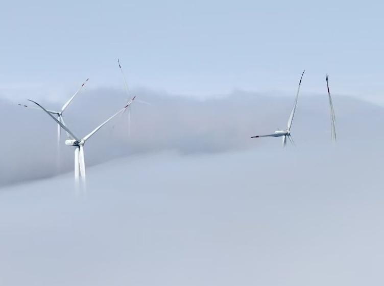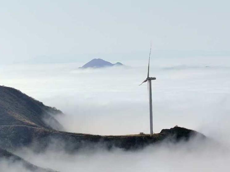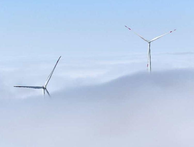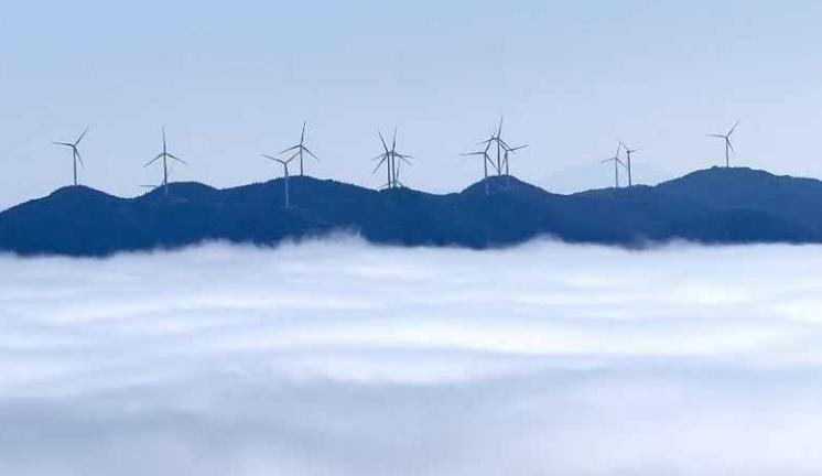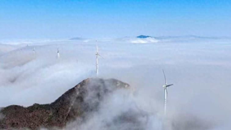 此处海拔超过1500米。雨后,微风轻柔地拂过,天空呈现出一片湛蓝。庞大的风力发电机组在云雾缭绕中时隐时现,宛如被大地所托举。晨光中,山峦被雾气所笼罩,宛如大自然披上的洁白纱幔。在蓝天映衬下,风车格外醒目,叶片旋转如同舞者的舞姿。这无疑是一场令人目不暇接的视觉盛宴。
