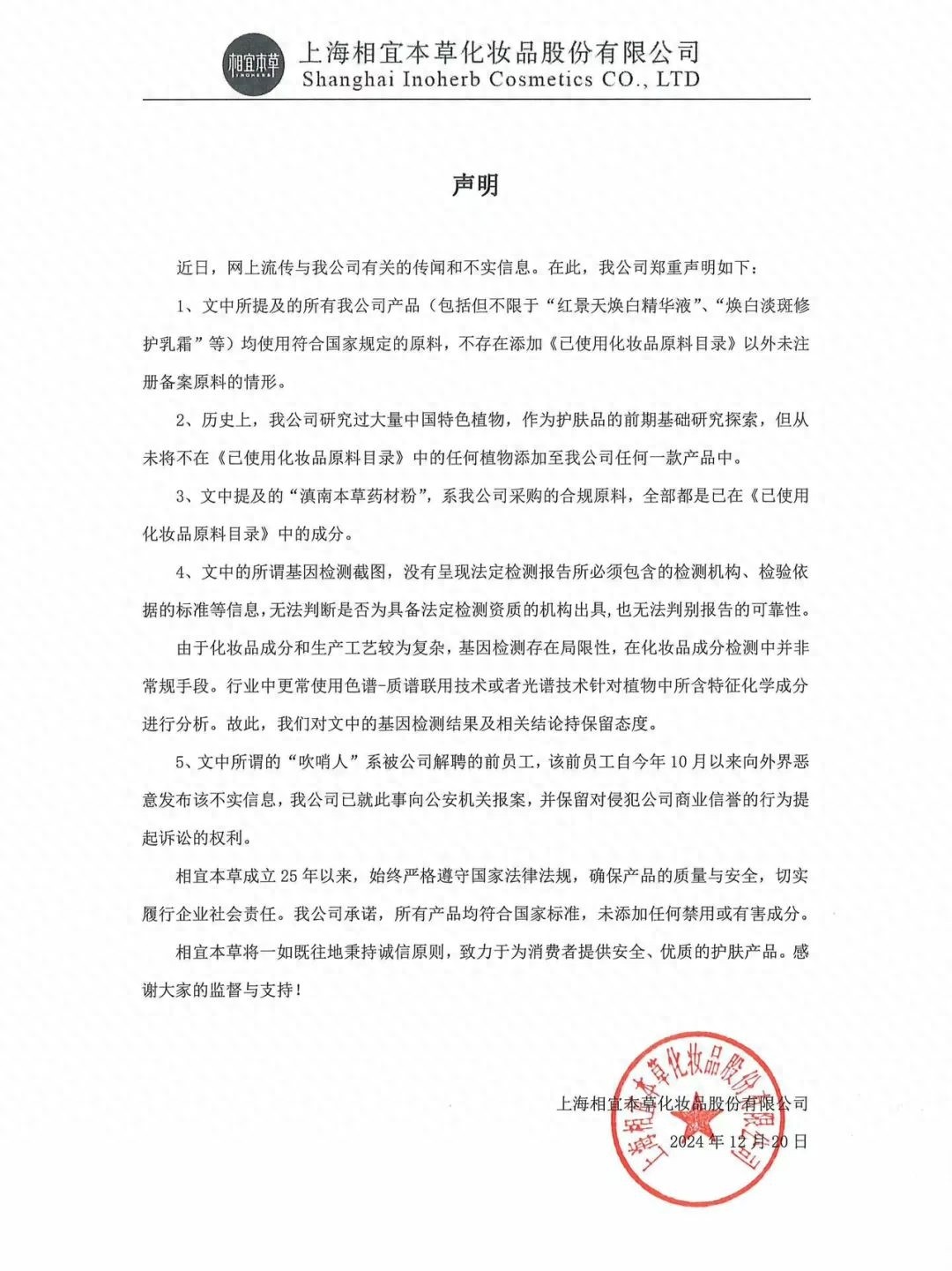 12月20日,相宜本草发布声明。自公司成立至今已有25年,公司一直恪守国家相关法律法规。这一举措体现了公司对自身的高标准要求,并强调将产品质量和安全作为企业发展的基石。面对激烈的市场竞争,化妆品的质量问题成为消费者关注的焦点。声明中明确指出,公司所有产品均符合国家相关标准,不含任何禁用或有害成分,旨在消除消费者的疑虑。