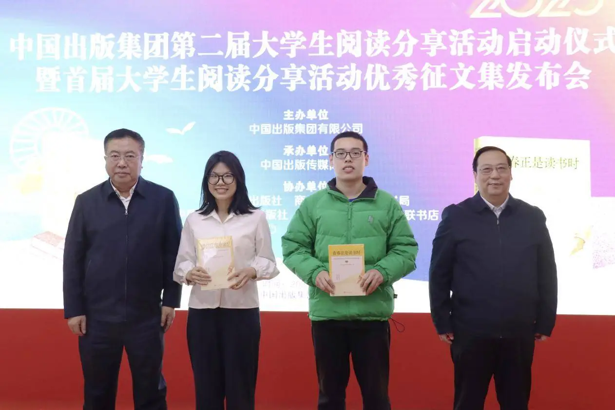 第二届大学生阅读分享活动正式开启,得益于征集启事和启动视频的同步发布。活动日,一场备受关注的赠书活动吸引了众多关注。中国出版集团有限公司总经理常勃和副总经理臧永清,向来自北京外国语大学的唐雅晴同学及中国农业大学的李烁同学,颁发了新书——《青春正是读书时——中国出版集团首届大学生阅读分享活动优秀征文集》。该书由人民文学出版社出版,汇集了首届活动的优秀征文,真实反映了当代大学生的阅读热情和风采。