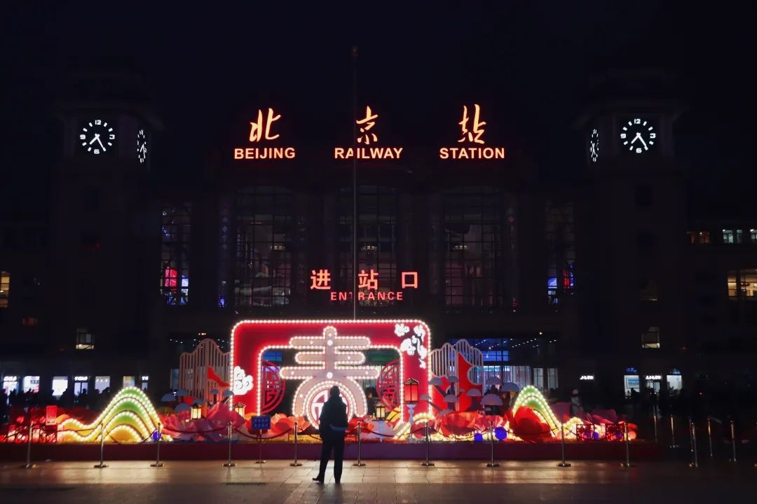 北京北站以祥云灯球为核心景观,配以玫瑰和礼盒点缀,寓意美满团圆,春意盎然,营造出温馨浪漫的氛围。清河站则以“年年有余”为主题,莲花和拱门衬托跃动的锦鲤,表达了对民众生活幸福美满的美好祝愿。