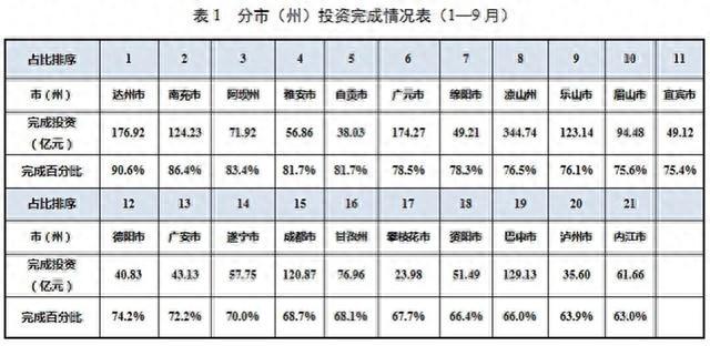 对全省21个市(州)的投资进度数据进行分析,结果显示超过75%的市(州)进度超过了既定目标,具体有11个市(州)表现优异。特别是达州市、南充市和阿坝州,它们分别完成了年度目标的90.6%、86.4%和83.4%,成效显著。然而,部分市(州)的投资完成率不尽如人意,这一情况反映出地区发展不平衡的矛盾。