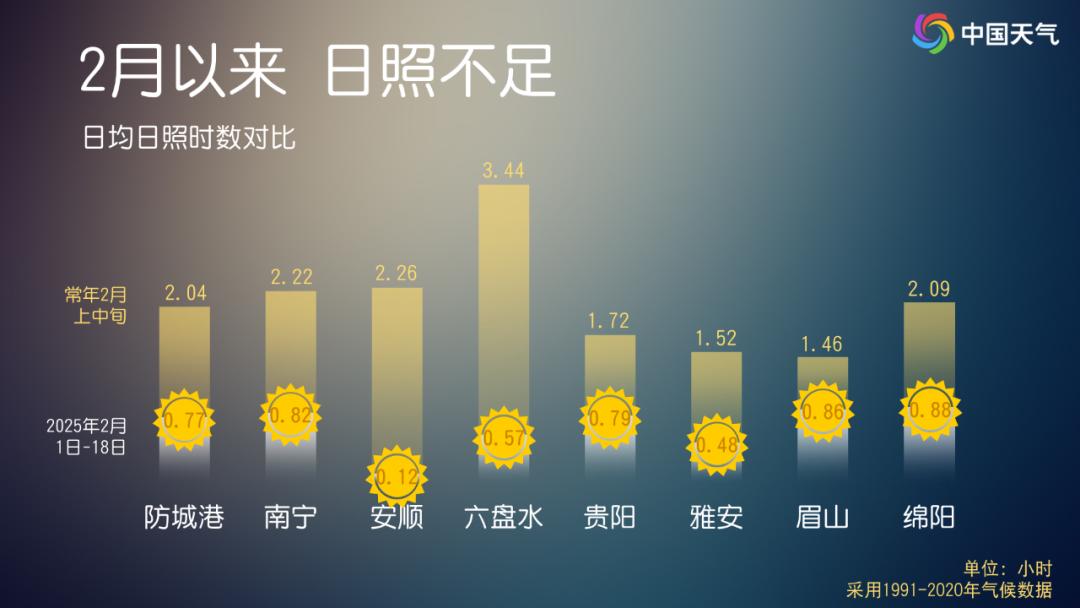 自二月起,南方多区域连续降雨,导致阳光变得稀少。以贵州和广西为代表,两地日均日照时长不足一小时,较去年同期大幅降低。四川东部、重庆以及湖南大部分区域,日均日照时长亦未超过两小时。连绵阴雨给市民生活带来诸多不便,衣物难以晾干的情况日益增多。