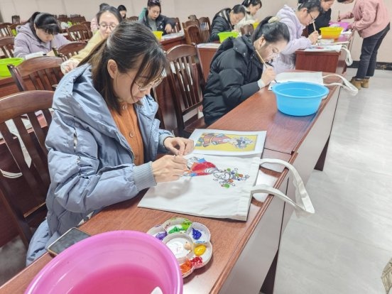 在手工制作领域,众多女性劳动者肩负着“非物质文化遗产传承者”的重任。她们选用无色帆布袋作为创作平台,运用环保颜料细致描绘和上色。现场洋溢着欢声笑语,女工们情绪高涨。她们中有人复现了“侗妹弹琵琶”的传统画面,有人将侗族的鼓楼、梯田、茶园等特色元素巧妙地融合进现代设计,创意层出不穷。