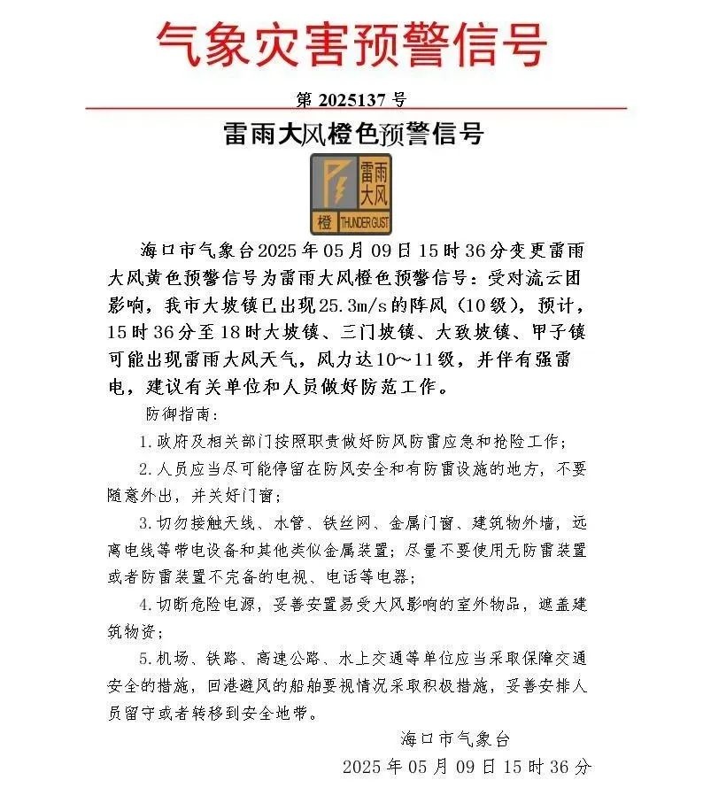 在15时36分至18时期间,海口市的大坡镇、三门坡镇、大致坡镇以及甲子镇可能遭受雷雨和大风的侵袭。截至目前,大坡镇已观测到风速达到25.3米每秒的短时强风(相当于10级风力)。根据预报,此次雷雨大风的强度可能达到10至11级,并且伴随着强烈的雷电活动。